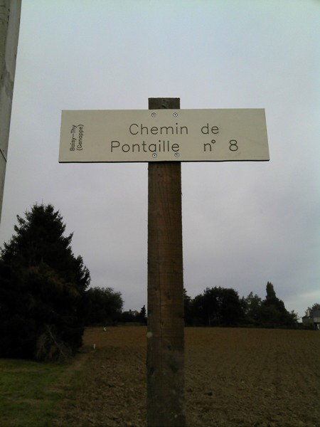 Chemin n° 10 au croisement avec la rue du Try au Chêne. Ce panneau est à la limite avec Bousval, où ce chemin porte le numéro 6. |