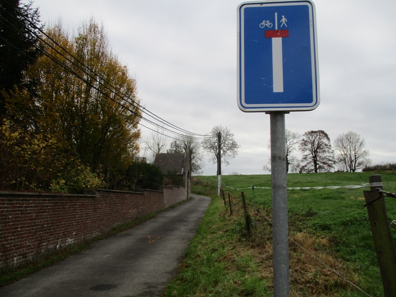 Rue de la Houlette(Chemin n°4) au croisement avec le chemin de la Bruyère du Coq (Sart-Dames-Avelines). Voie sans issue débouchant sur le chemin du Bois d'Hez n° 50